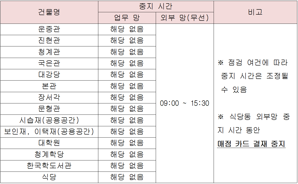 ※ 일부 업무망 및 비 중지 건물에서도 장애가 발생할 수 있음.