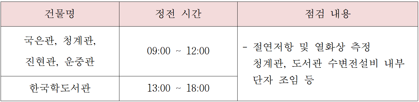 전기안전관리법 제22조 및 동법 시행규칙 제30조에 의한 전기안전관리자의 안전관리 직무에 따라 국은, 청계, 진현, 운중관, 한국학도서관 건물의 전기설비를 점검하기 위하여 다음과 같이 정전을 실시할 예정이오니 협조하여 주시기 바랍니다.